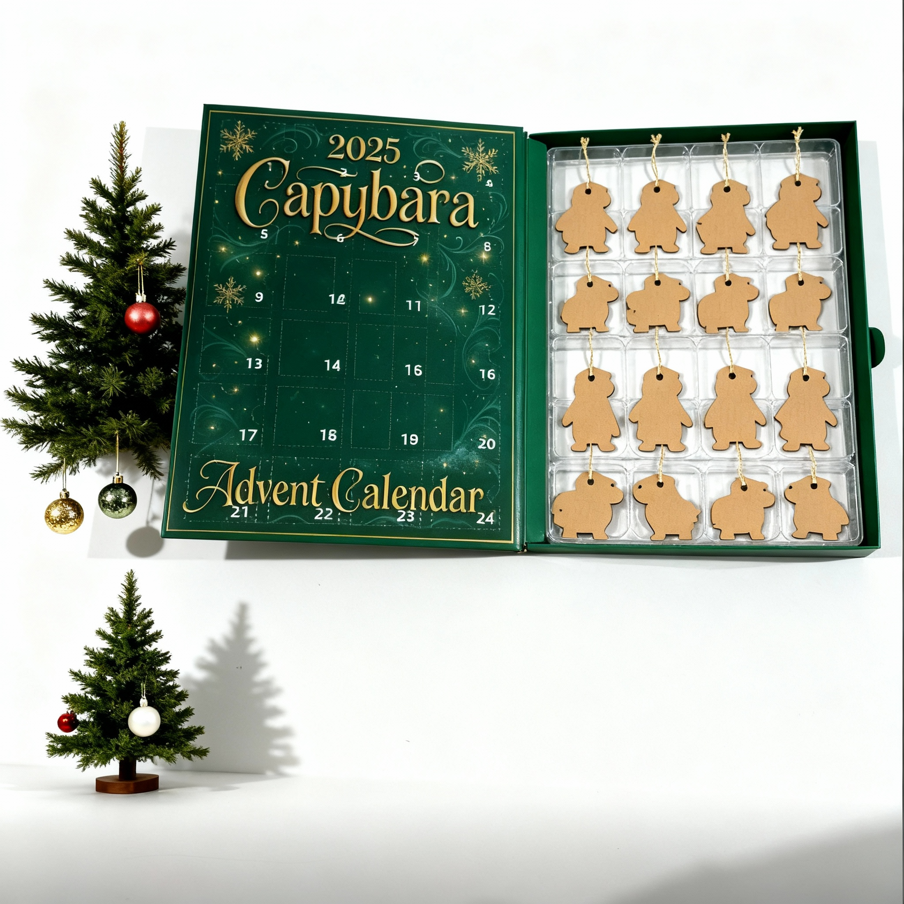 Note: every capybara inside is a flat printed ornament made to hang in your Christmas tree not a 3D figure